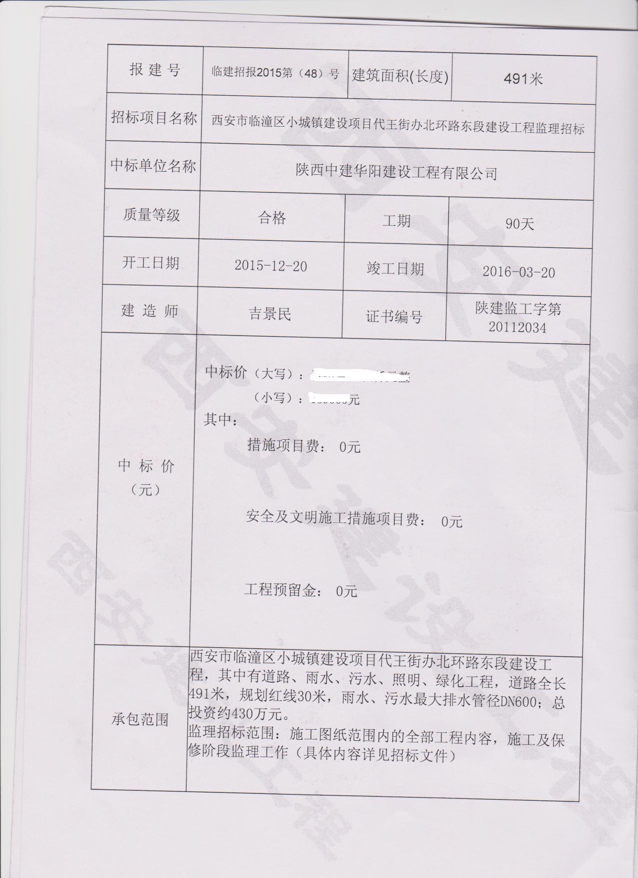 中建華陽公司中標(biāo)西安市臨潼區(qū)小城鎮(zhèn)建設(shè)項(xiàng)目代王街辦北環(huán)路東段建設(shè)工程監(jiān)理