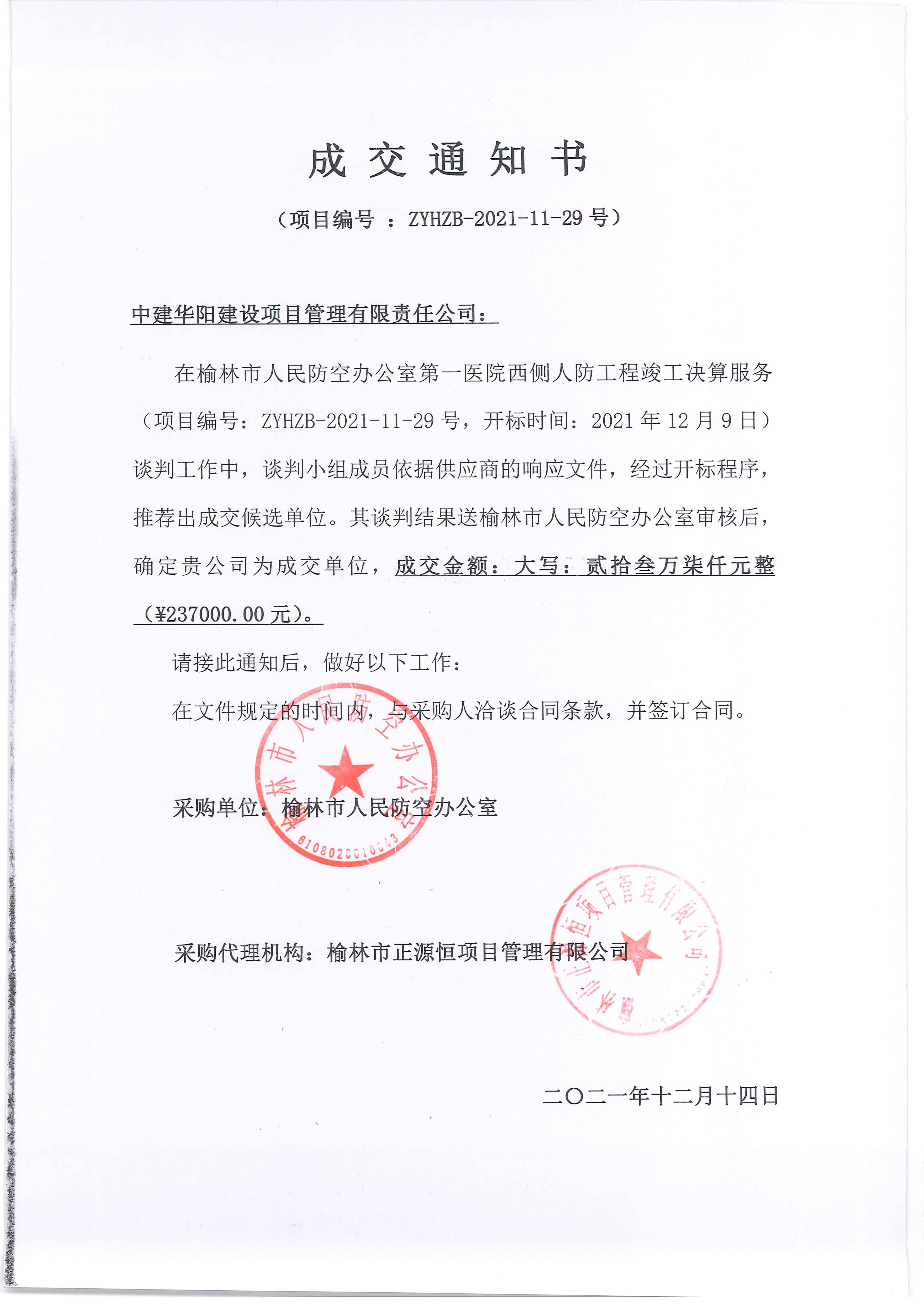 中建華陽公司中標榆林市人民防空辦公室第一醫(yī)院西側(cè)人防工程竣工決算服務(wù)
