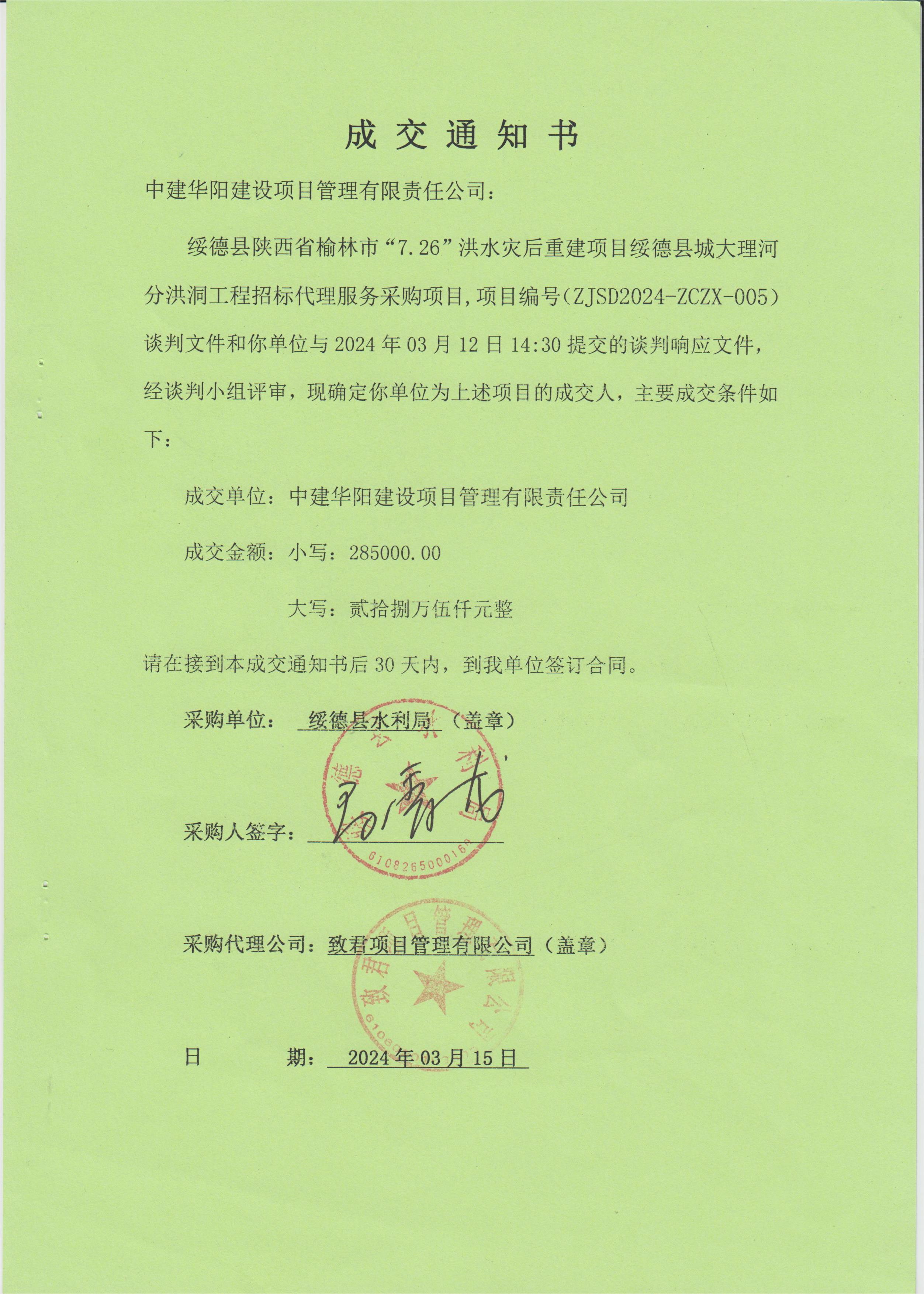 中建華陽公司中標綏德縣陜西省榆林市“7.26”洪水災(zāi)后重建項目綏德縣城大理河 分洪洞工程招標代理服務(wù)采購項目